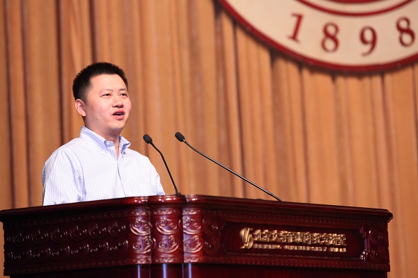 教师代表、电子学系2012级本科生班主任彭超老师首先发言。彭超讲述了自己与燕园的故事,并与同学们分享自己心目中的北大精神。他希望同学们能找到自己的人生目标和价值,同时保有理想,不忘北大人的担当,最后预祝毕业生学业进步、事业有成。