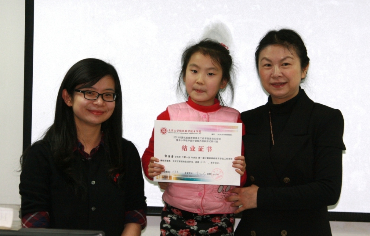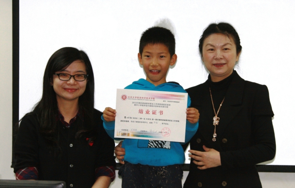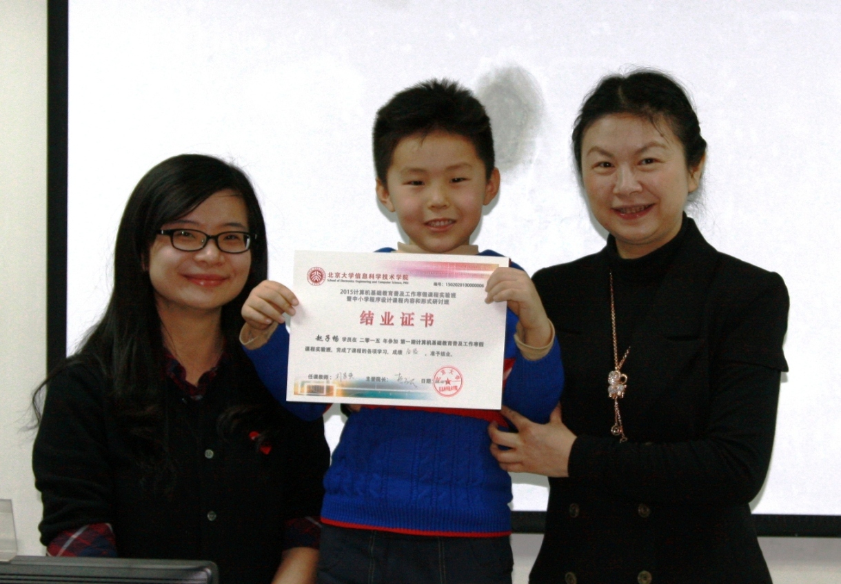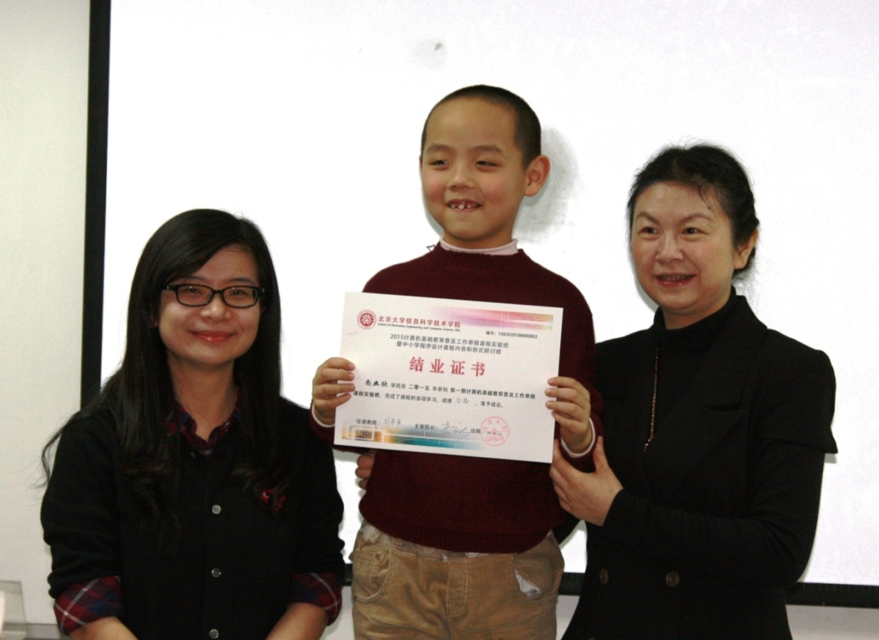 李文新副院长充分肯定了本次小学段程序设计寒假实验班的组织与教学工作,并与刘家瑛老师共同为每位学员颁发结业证书。