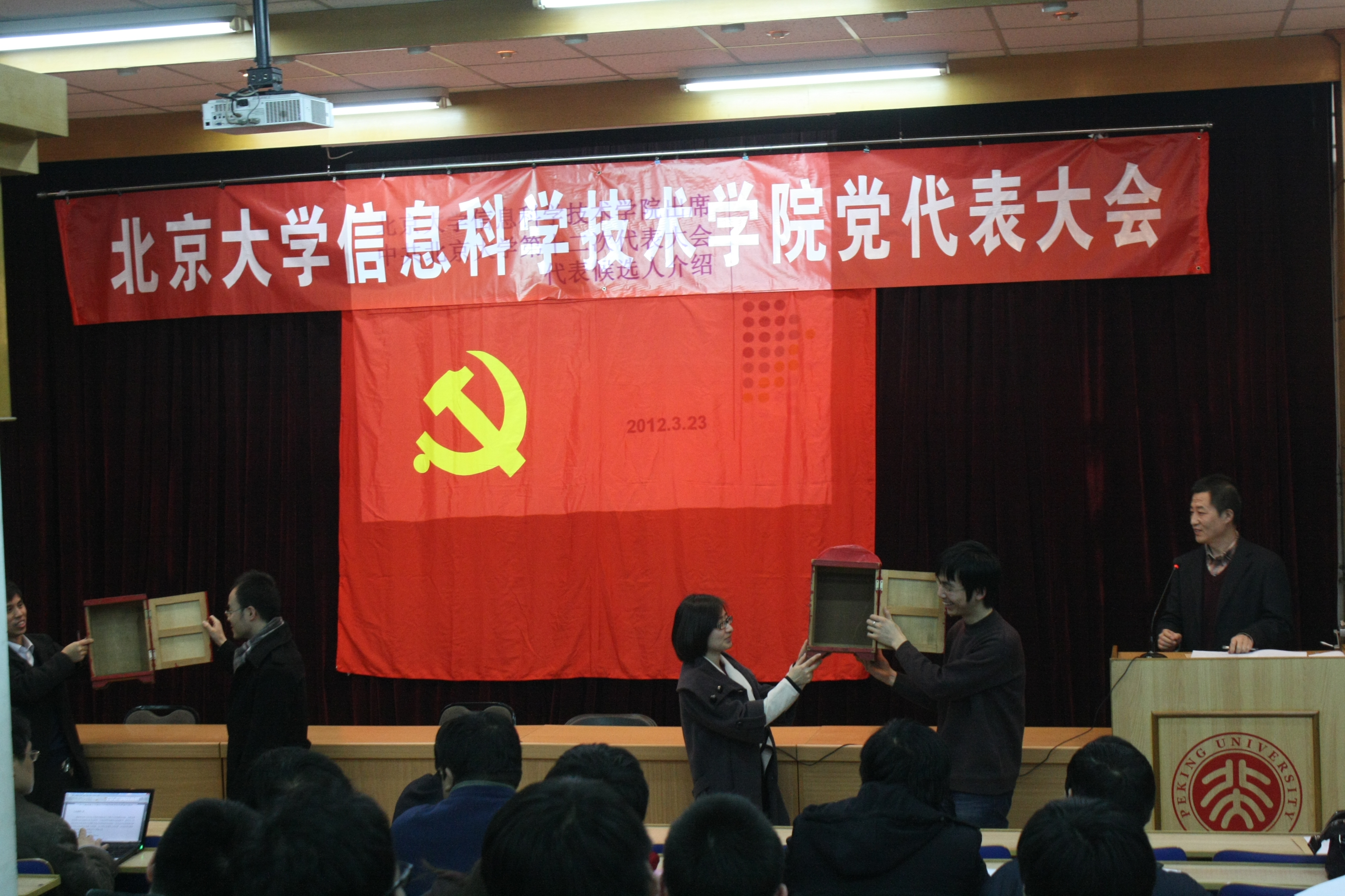 监票人检查票箱 本次党代表大会在学校党委的统一领导下,认真贯彻学校党委有关党代表选举工作的规定和要求,充分调动广大党员的积极性,确保党组织覆盖面和党员受教育率达到100%。为了确保大会的顺利召开,完成代表推荐、选举工作,91直播 党委多次召开党委会和党支部书记会议,研究部署各项具体工作,以高度负责的态度、严谨细致的工作作风,确保推荐提名和选举工作的万无一失。与会党代表充分表现出了共产党员的优良品质,克服困难,积极参与,切实履行代表职责,充分发挥代表作用。在本次大会上,有少数教师、学生党员代表或者改变出差行程、或者调整实习计划、或者克服身体困难,前来参会并投下庄重的一票。在91直播 党委的领导和全体党员的共同努力下,代表推荐、选举工作已圆满完成,全院师生将凝心聚力、开拓创新,以更加饱满的热情和优异的成绩迎接北京大学第十二次党代会的胜利召开。