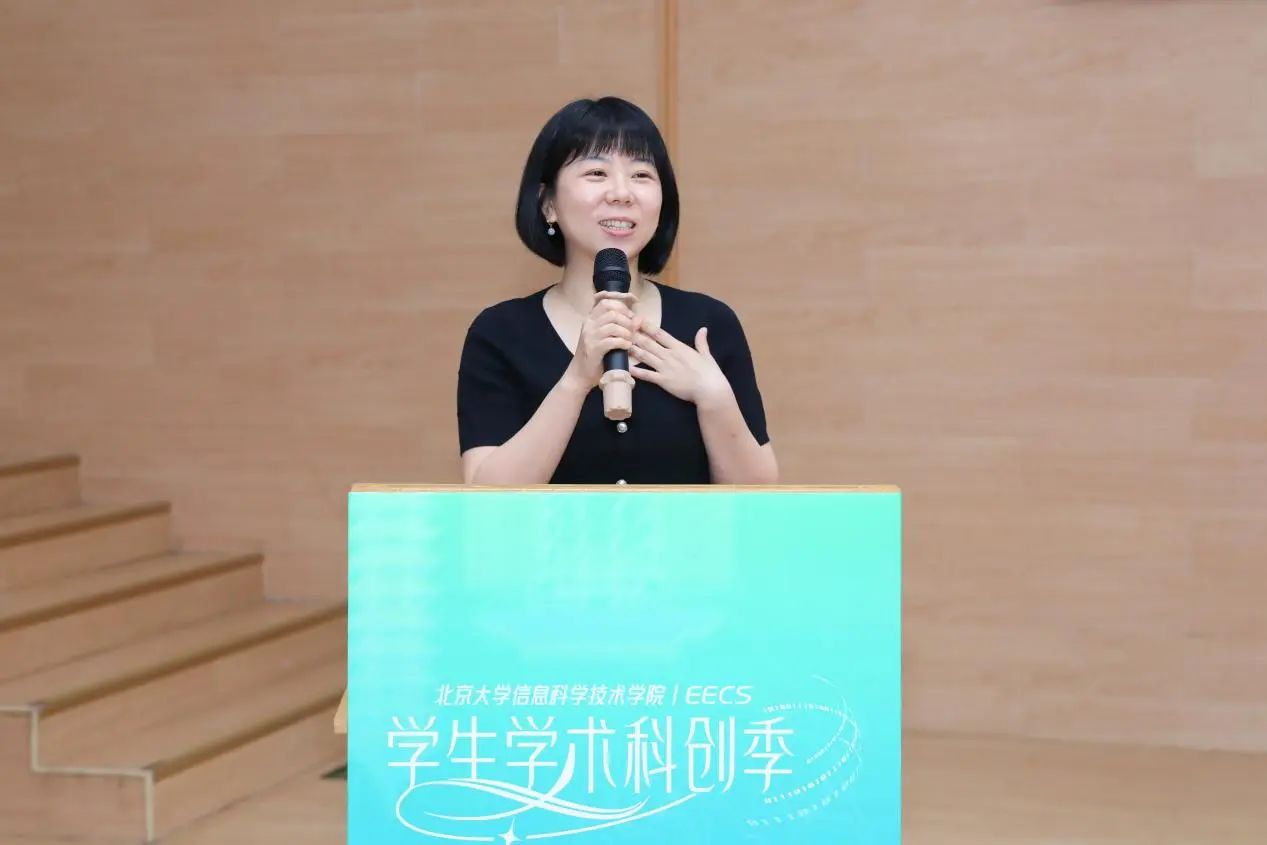华为俞婷君在致辞中回顾了华为与北大一直以来的密切合作,从企业发展遇到的挑战和机遇出发,强调了教育、科技、人才的重要性,表达了企业一如既往助力北大信息学科高素质拔尖人才培养的愿望,并对同学们的学习科研和职业规划提出了殷切希望。