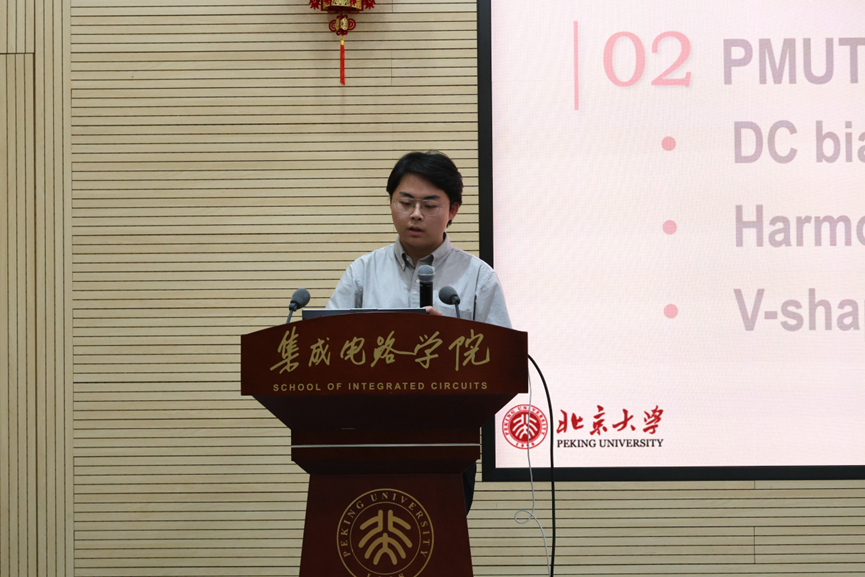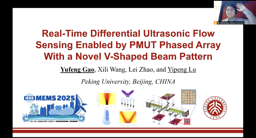 2021级本科生高毓风在该会上作为第一作者展示了论文 Real-time Differential Ultrasonic Flow Sensing Enabled by PMUT Phased Array with a Novel V-shaped Beam Pattern (《基于压电微机械超声换能器相控阵所产生新型“V”字型声场的实时差分流速传感》)。此篇文章打破既往对于声学栅瓣的刻板认知,突破此前声学换能器间距设计的半波长限制,开创性地利用多通道换能器相位优化控制实现了对称的“V”字型声场,并将其应用于拥有广阔应用前景的流量监测,解决了超声流量计在高精度流量监测中的实时性问题。该文章内容受到大会科技委员会的高度认同,获得此届大会“最佳学生论文奖”的提名(Outstanding Student Paper Nominee)。这也是高毓风连续第二年在该微纳机电系统领域的国际顶级学术会议以第一作者身份发表文章。该文章的通讯作者为集成电路91直播