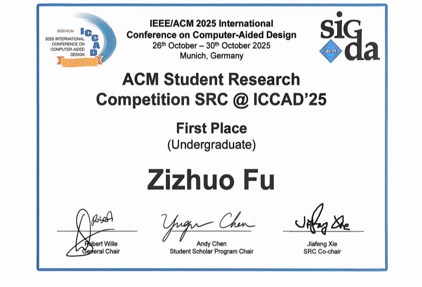 积极鼓励学生参加各类科技类竞赛,在国际舞台上充分展现了北大学生的科研实力与创新潜能。本届 SRC 竞赛由美国计算机学会(ACM)设计自动化专业委员会(SIGDA)主办,是国际集成电路与电子设计自动化领域最具影响力的学生科研竞赛之一。来自全球多所高校的31名优秀学生入围首轮评选,经过海报展示和现场答辩评审,傅子酌最终脱颖而出,摘得本科生组桂冠。