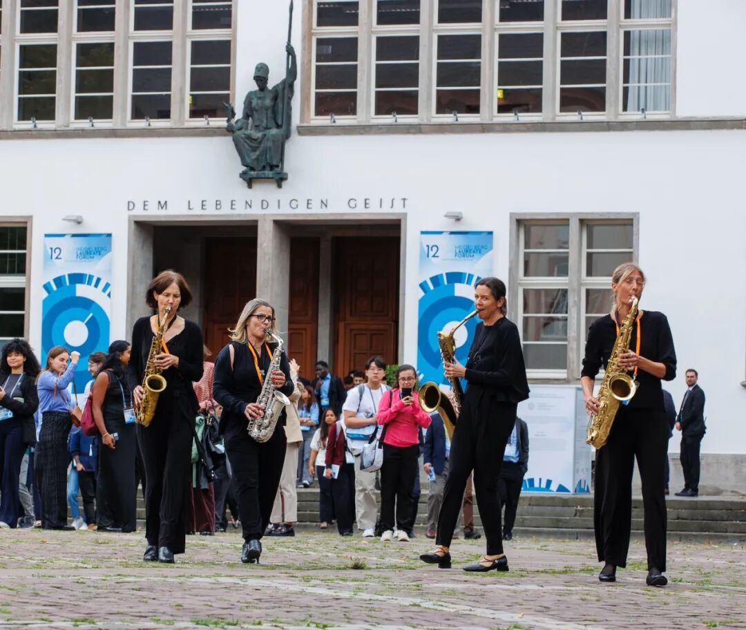 9月14日下午,活动正式开幕。身边是来自世界各地、面貌各异的年轻学者,虽尚不相识,但随着交流增进,他们的形象在我心中逐渐勾勒清晰。论坛主持人、市政府代表、往届参与者及桂冠学者先后致辞,最令人惊喜的环节当属在仪式间歇款款登台的萨克斯乐队。四位女乐手每年都受邀献艺,乐声欢畅、步伐灵动,娴熟技艺间尽显行家里手的优雅从容。在常规的开幕致辞之外,竟有非人声的乐音融入「海德堡论坛」的独有仪式,着实别开生面。