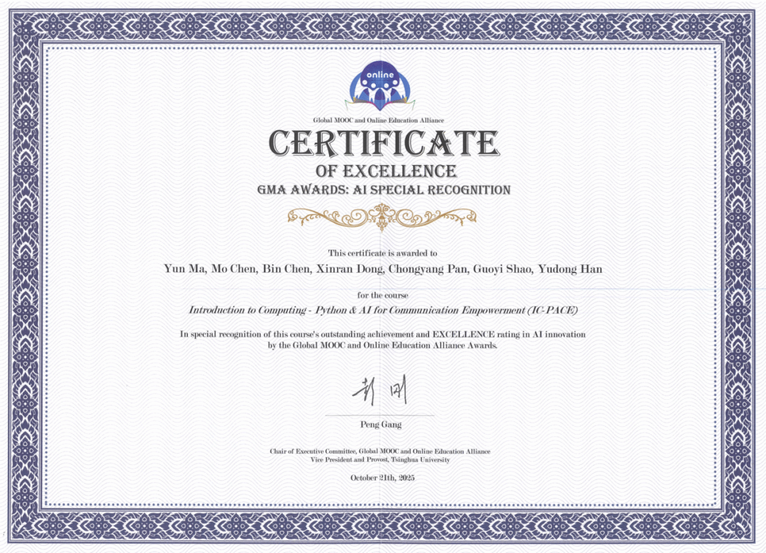 当地时间12月2日至4日,2025世界慕课与在线教育大会在墨西哥国立自治大学举行。北京大学“计算概论C”体育教育专业(新闻传播方向)课程(IC-PACE: Introduction to Computation - Python & AI for Communication Empowerment)荣获2025年世界慕课与在线教育联盟“优秀课程奖:AI特别奖”(GMA Awards: AI Special Recognition)。