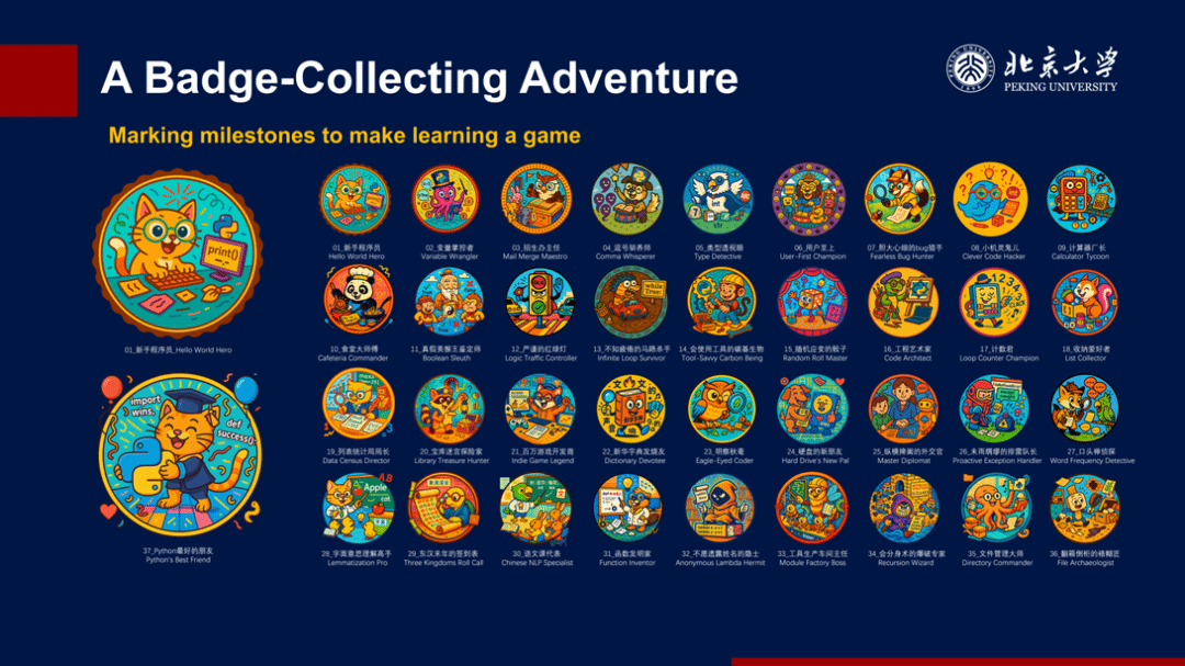 四是游戏化学习设计。 课程设计了一套勋章成就系统,从“Hello World”到“Python's Best Friend”,随着课程推进,在关键节点解锁对应能力勋章,让学习可视化、有动力、更有趣。
