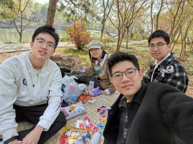 阳光透过新叶,洒下斑驳光影。行至公园中段,大家在湖边草坪,铺开野餐垫,围坐一起,分享自带的水果、零食,玩起了桌游,笑声不断,气氛热烈。